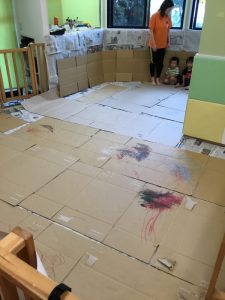 保育者が、保育室中に段ボールや模造紙を貼っていると