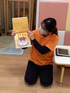 「手をたたいて、大きな声でおめでとうって言ってね!せーの♡ぱちぱちぱち…」