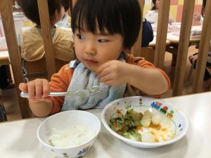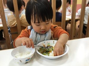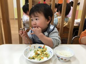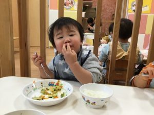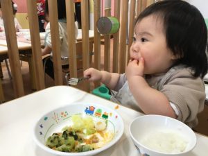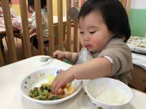 手づかみだけでなくスプーンも使って1人で食べられるようになってきました‼️