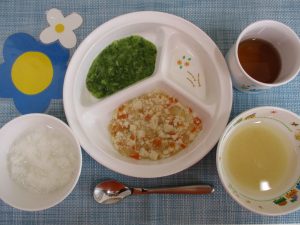 (写真は中期食です。月齢によって形、固さ、盛り付け量を変えて提供しています。)