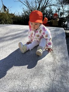 近くの石のオブジェで遊んだり総合遊具で遊んだりしました。
