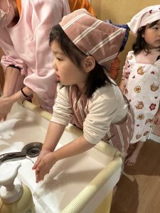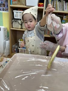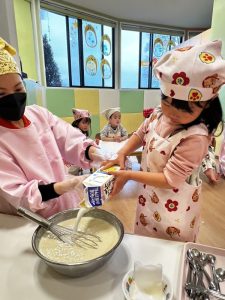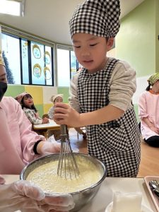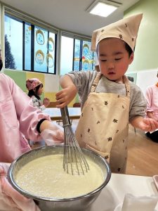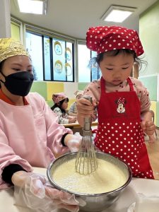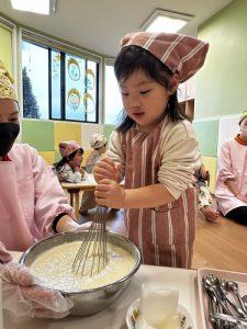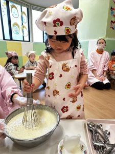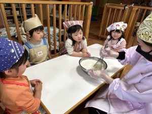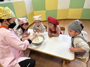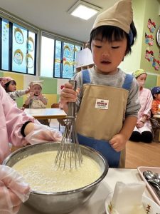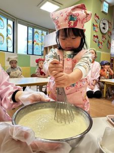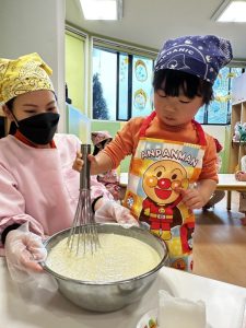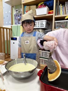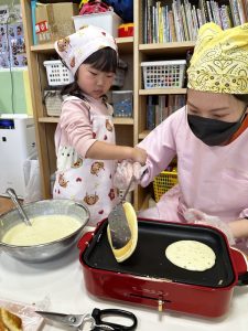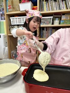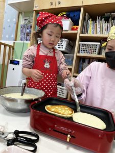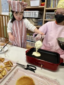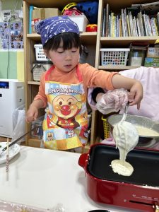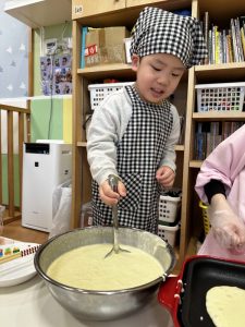 その後は、保育者と一緒にホットケーキを焼くことに挑戦✊