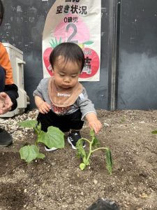 トマト、なす、ピーマン、きゅうりの苗に興味津々の子どもたち🔍✨