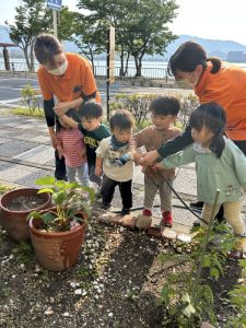 花壇で育てている野菜たちに水やりをしてくれています♪