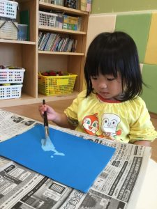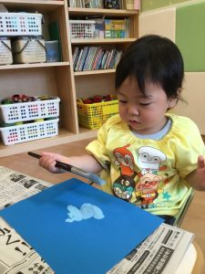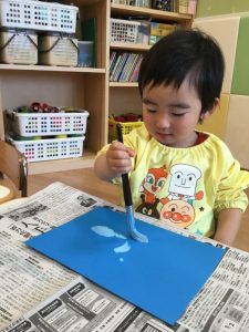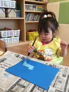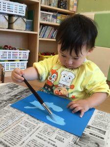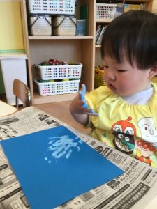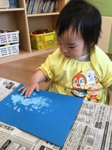 手のひらに絵の具を塗って手型スタンプをしたりと
