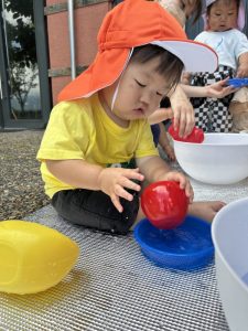 いちご組はプール遊びに向けて水遊びをしました。