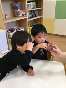 「ちゃいろだよ!」「違うよ!むらさき色だよ(^^)」