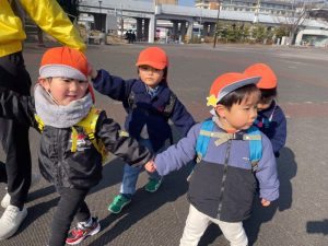 友だちや保育者と手を繋いで歩く子どもたち![]()