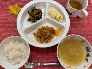 今日の給食は、チキンチャップでした。肉料理が好きな園児さんが多く、食べ進みもよかったです。