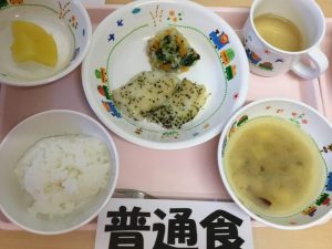 本日のお給食です <普通食> ★ご飯 ★さつまいものお味噌汁 ★白身魚のゆかり揚げ ★...