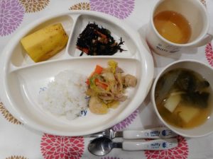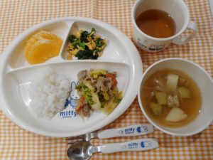☆2月19日(月)☆ ・ご飯 ・さつま芋とじゃがいもの味噌汁 ・豚肉の味噌炒め ・山吹あえ ・みかん