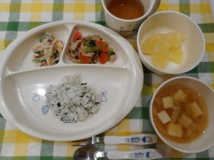 ☆2月22日(木)☆ ・ご飯 ・豆腐と葱のみそ汁 ・切干大根のごま酢あえ ・青菜の炒め煮 ・パイン缶