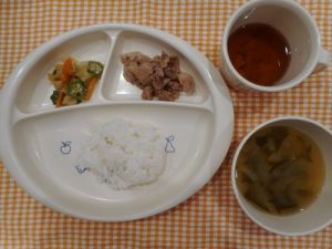☆本日の給食☆鶏のマーマレード焼き☆ ☆本日の離乳食☆そぼろ煮☆