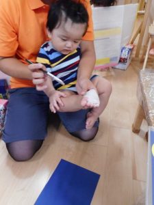 足型を取りました!足にハケで絵の具をぬりぬり☆ちょっとくすぐったそうにしていましたが♪