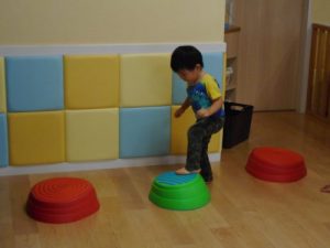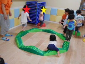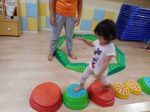 平均台の上には、やわらかな突起があったりと足の裏の刺激にもなるんですよ♪