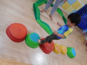 飛び石平均台をつなげて置いて橋のようにしたり、波の形状のものは丸にしたり、一本の道になるようにもつなげられて、