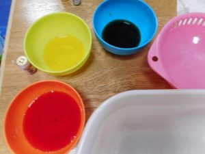 食紅を水で溶くと、こんなにきれいな色になります♪