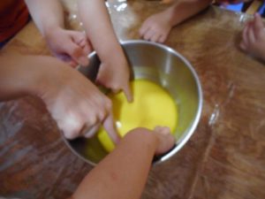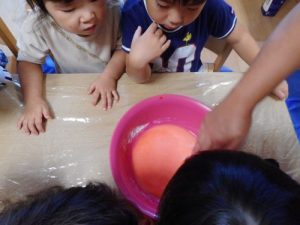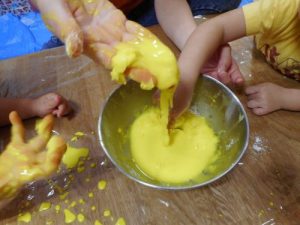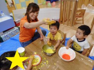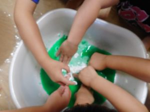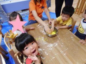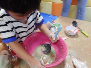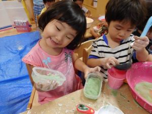 黄色と緑のスライムも作って、みんなで混ぜ混ぜしました~(^_-)-☆