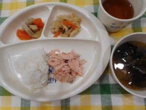 給食の前にはお当番さんが前に出て「給食ありますか?」「スプーンありますか?」「スープありますか?」など