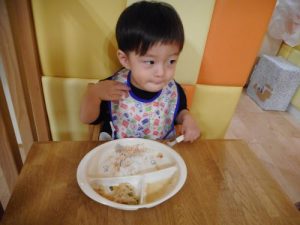 2歳さんは上手に食べられるようになったので、エプロンは卒業しました~♪