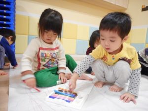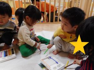 のんびり少人数でお絵かきタイム♪クーピーを使って、思い思いに線路を描いたり、ぐるぐるを描いたりとお絵かきを