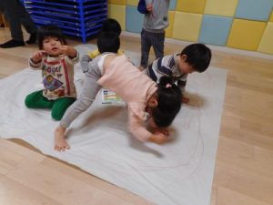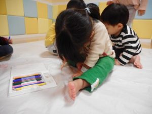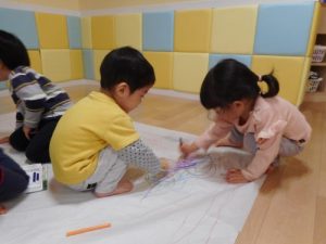 模造紙をくっつけて、先生が大きな大きなキャンパスを作ってくれました♪そのキャンパスを床に貼り、