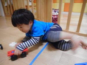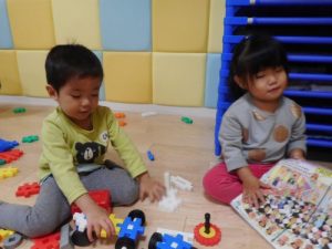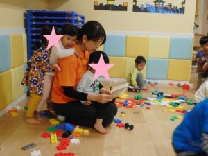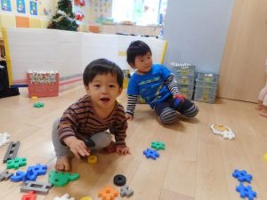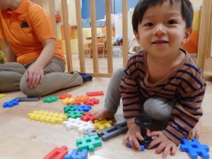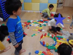 先生たちに囲まれて、安心しながら楽しく遊んでいます♪車を作ったり、自分で考えてブロックをつなげて作ったりと、