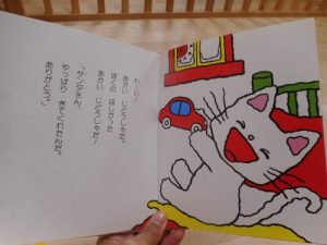 わーい! あかい じどうしゃだ。 ぼくの あかい じどうしゃだ!