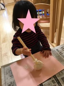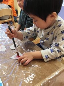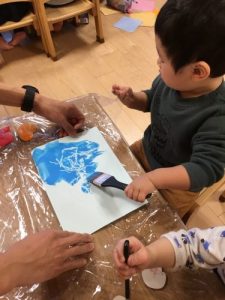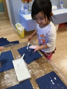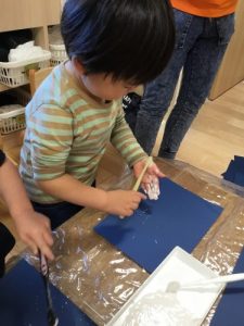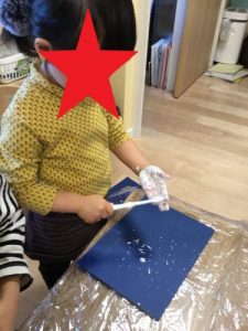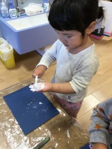まずは、白い絵の具を使って雪づくり!手の平を絵の具に付けて歯ブラシを手の平に押し付けるようにして弾いて、画用紙の上に絵の具の雪を降らせました♪
