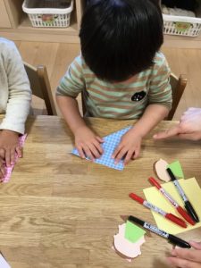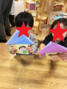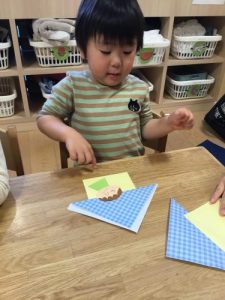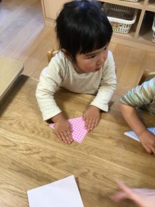 2歳児さんは、【折り紙折り】と【ブラッシング】に挑戦!!