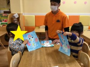 こちらのメインは「はじき絵」です!白い画用紙に一生懸命にぐるぐると丸をふたつ白いクレヨンで描きました♪そしてそして、なんと不思議!そこに絵の具を塗ると~♪