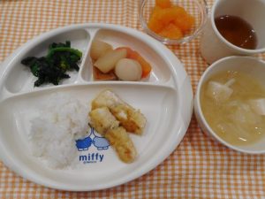 ☆本日の給食☆カジキのカラームニエル・おかか和え・煮物☆