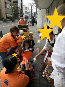 まずは、保育園のご近所にある お料理屋さん”兆治”さんにご協力頂き、お菓子を配って頂きました![]()