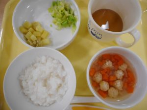 軟飯 肉団子スープ まぜまぜサラダ さつま芋の甘煮