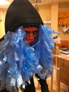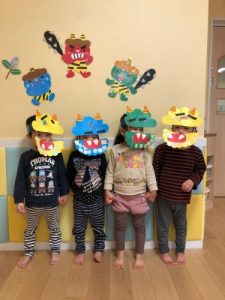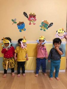 子どもたちも自分たちで製作した”鬼のお面”をつけて、