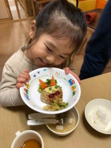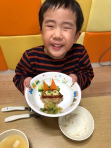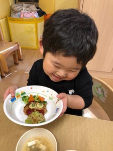 節分会のあとのお給食は、鬼さんのハンバーグ![]()