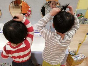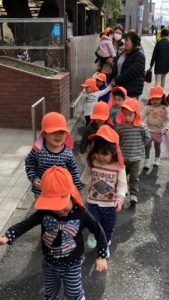 お散歩の出発前、先生と手遊びをして待っています![]()
