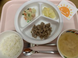 ※豚肉は、疲労回復効果が高いと言われ、しょうがは、殺菌力のある成分により、胃の調子を整える効果があるそうです。みんな大好きな豚肉のしょうが焼きは、体を元気にしてくれるパワフルメニューですね♪今日も完食でした!!