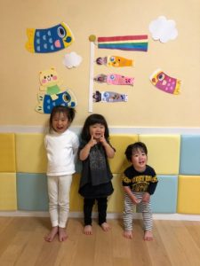 子どもたちが作ったこいのぼりと一緒に写真撮影したり楽しみました