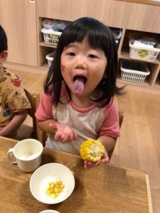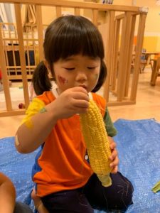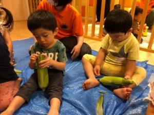 自分たちで皮をむいたとうもろこしの味は格別