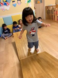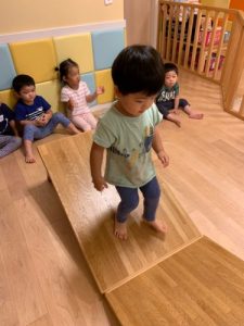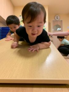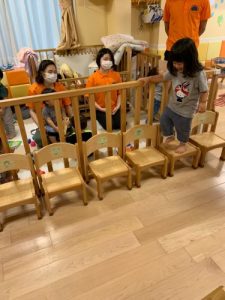 机や椅子で保育室内にアスレチックのようなサーキットを作りました
