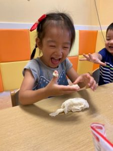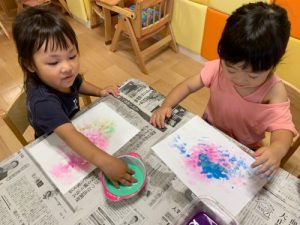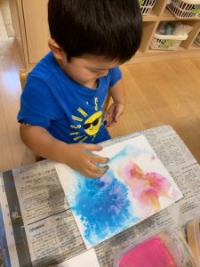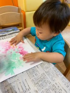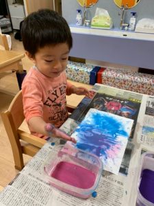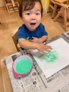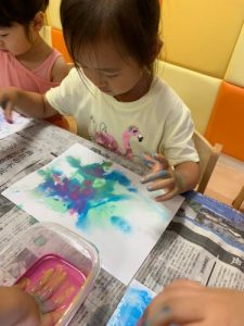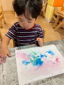 好きな絵の具の色を選んで、指で紙にペイントしました