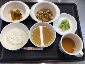 ご飯 味噌汁 鶏と野菜の煮物 ゆでかぼちゃ キウイ