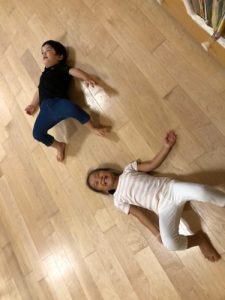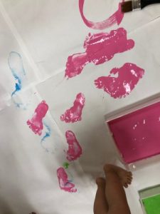 いざ始まると、みんな絵の具に、自分の手や足をペターーと思い切りつけて、床や壁に敷き詰めた模造紙に、お絵かきしたり、手形や足形をつけました