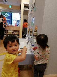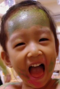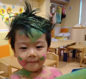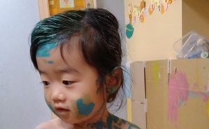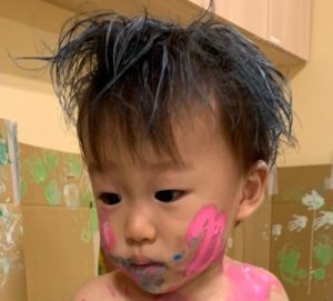 保育士やお友だちにもペタペターと絵の具を付け合って、ワイワイ楽しみましたよ