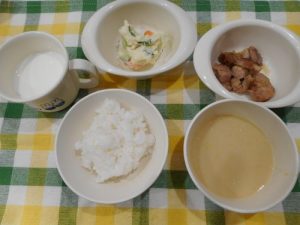 【離乳食(後期)】 エネルギー162kcal たんぱく質5.5g 脂質1.8g 粥 すまし汁 鶏ひき...