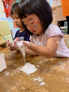 粉に水を足すことで、とろとろ~となっていく様子を見て、