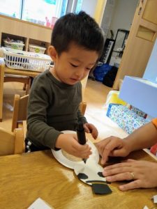 保育士が、うっすらと下書きの線を引いた上をなぞりましたが、