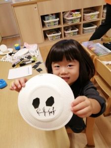 マジックで、紙皿にガイコツ(しゃれこうべ)を描きました![]()