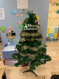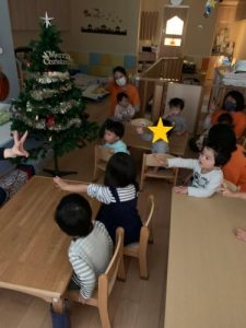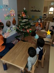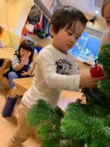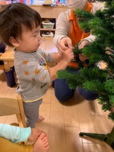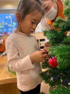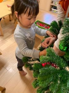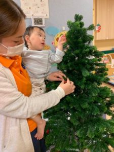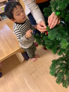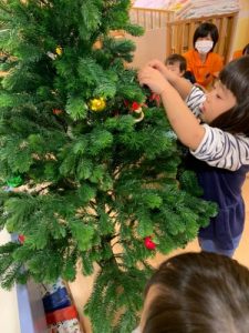 園ではクリスマスツリーを出して、みんなで飾り付けを行いました